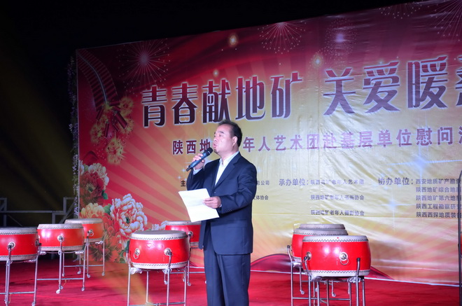 2015年10月19日下午十九點三十分由陜西省地質(zhì)礦產(chǎn)開發(fā)總公司、陜西地礦總公司老年人文體協(xié)會主辦的“青春獻地礦 關(guān)愛暖桑榆”重陽節(jié)下基層慰問演出在我隊舉行。總公司副總經(jīng)理艾亞雄、副總工程師王根寶及總公司有關(guān)部門負責人、部分兄弟單位的領(lǐng)導(dǎo)、我隊領(lǐng)導(dǎo)班子成員一同觀看了演出。隊黨委書記王戰(zhàn)社發(fā)表了熱情洋溢的致辭。
