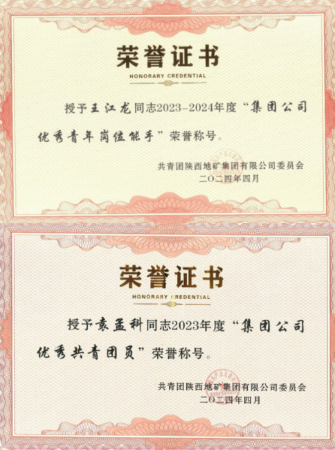 4月26日,在陜西地礦集團(tuán)團(tuán)委慶祝中華人民共和國成立75周年團(tuán)青先進(jìn)表彰暨“青春為中國式現(xiàn)代化挺膺擔(dān)當(dāng)”主題培訓(xùn)會上,我公司王江龍同志榮獲陜西地礦集團(tuán)2023-2024年度“優(yōu)秀青年崗位能手”稱號,袁孟科同志榮獲陜西地礦集團(tuán)2023年度“優(yōu)秀共青團(tuán)員”稱號。