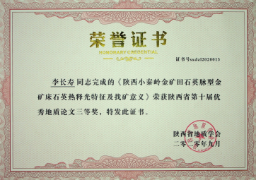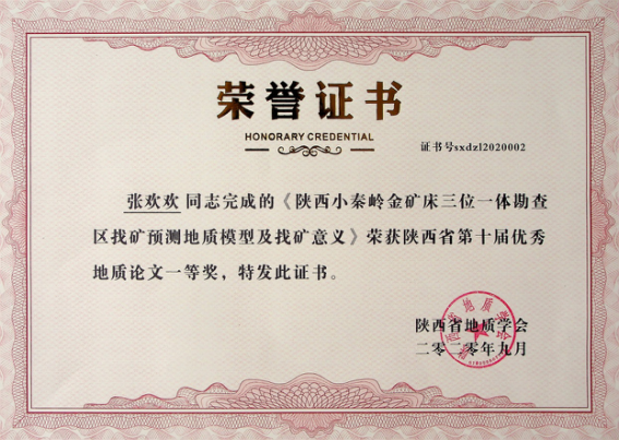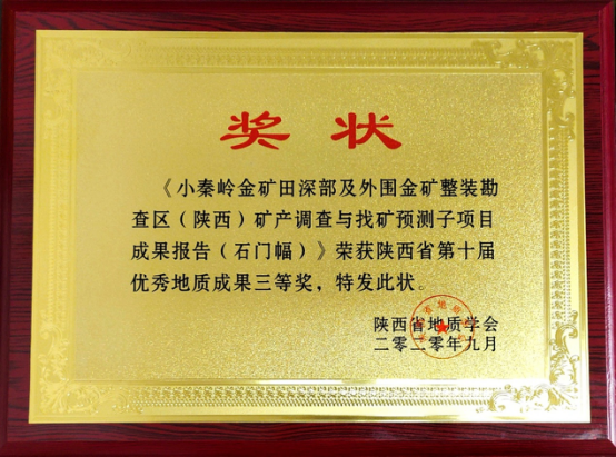 由我公司地調(diào)所編制完成的“小秦嶺金礦田深部及外圍金礦整裝勘查區(qū)(陜西)礦產(chǎn)調(diào)查找礦預(yù)測(cè)子項(xiàng)目(石門幅)成果報(bào)告”獲陜西省第十屆優(yōu)秀地質(zhì)成果三等獎(jiǎng);張歡歡同志撰寫的“陜西小秦嶺金礦床三位一體勘查區(qū)找礦預(yù)測(cè)地質(zhì)模型及找礦意義”獲優(yōu)秀地質(zhì)論文一等獎(jiǎng);李長壽同志撰寫的“陜西小秦嶺金礦田石英脈型金礦床石英熱釋光特征及其找礦意義”獲優(yōu)秀地質(zhì)論文三等獎(jiǎng)。