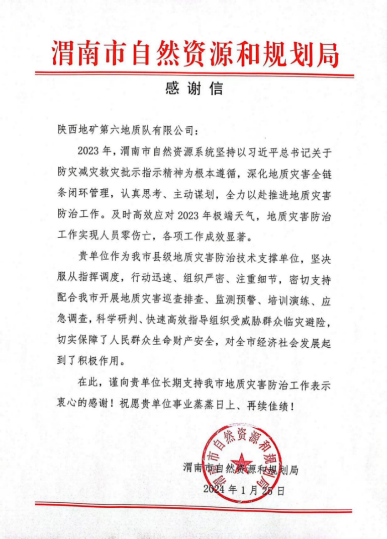 2024年1月26日,渭南市自然資源和規(guī)劃局向我公司發(fā)來(lái)感謝信,對(duì)陜西地礦第六地質(zhì)隊(duì)有限公司為渭南市地質(zhì)災(zāi)害防治工作做出的貢獻(xiàn)和辛勤付出表示衷心的感謝。