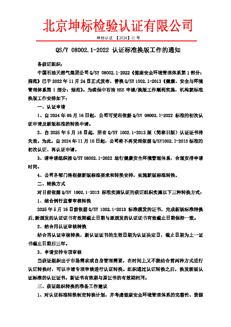 QS/Y 08002. 1-2022認證標準換版工作的通知 坤標認證[2024] 11號