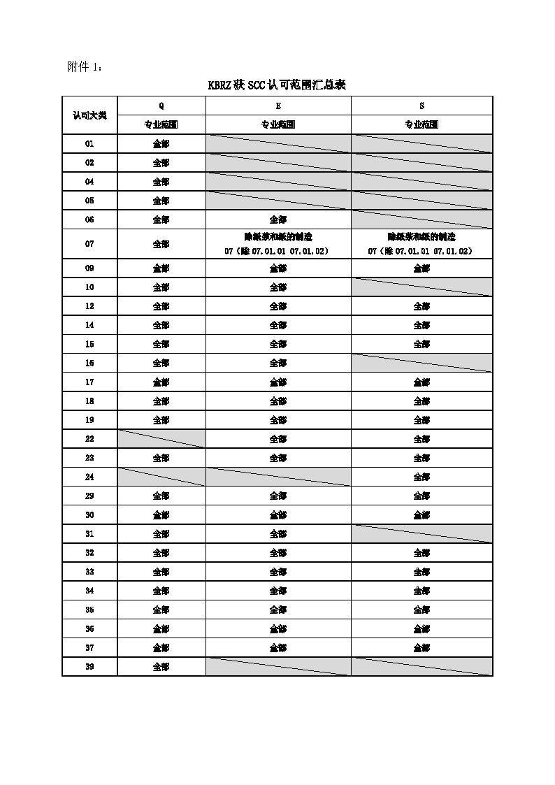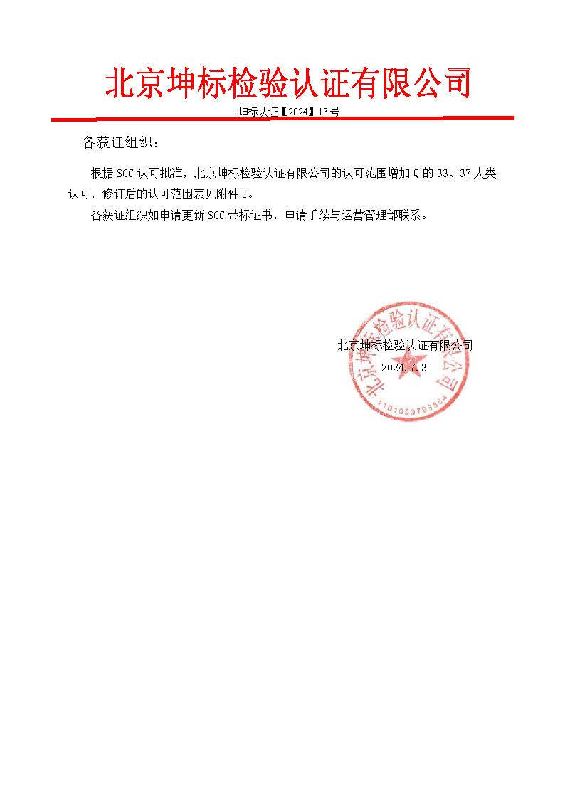 根據(jù)SCC認(rèn)可批準(zhǔn),北京坤標(biāo)檢驗認(rèn)證有限公司的認(rèn)可范圍增加Q的33、37大類認(rèn)可,修訂后的認(rèn)可范圍表見附件1。
